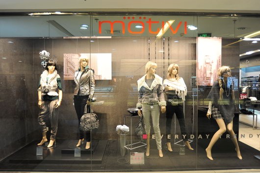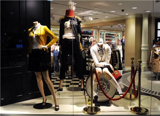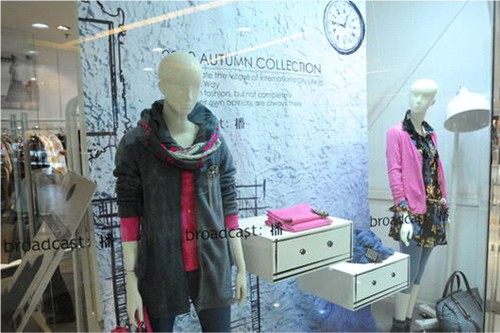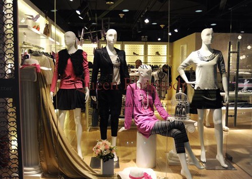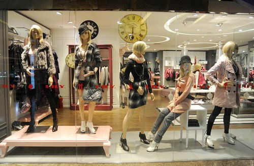 橱窗内的模特采用夸张的姿势,坐站结合的基本陈列方式,适合相对成熟的时尚女装。 .jpg)